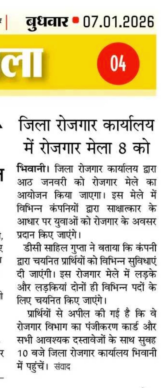 Haryana Rojgar Mela 2026 Notification: An employment fair will be held in the Bhiwani district of Haryana on 08 January 2026. Candidates from 10th to graduation can participate in it. And can get a job immediately. To participate in the employment fair, candidates should reach the interview at the given time and take all the documents with them. We will give you complete information about this recruitment below.