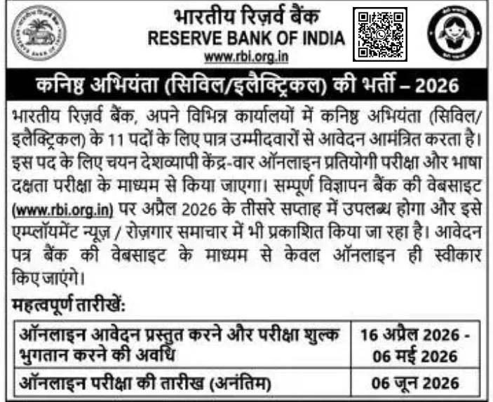 RBI JE Recruitment 2026 Notification: The Reserve Bank of India (RBI) has released the notification of RBI JE Recruitment 2026 for 11 Post on its official website. For this eligible candidates can apply online from 16 April to 06 May 2026 on the official website. We will give you complete information about this recruitment below.The official notification of recruitment was released on 16 April 2026, which can be downloaded from the link given below. Please visit www.SarkariJobHubs.com regularly for the Latest Govt Job 2026, 12th Pass Jobs. All details related to this recruitment like notification, qualification, age limit, eligibility, result, previous papers, online, how to apply, exam date, answer key, syllabus and admit card important dates, application fee, salary, etc are given below.